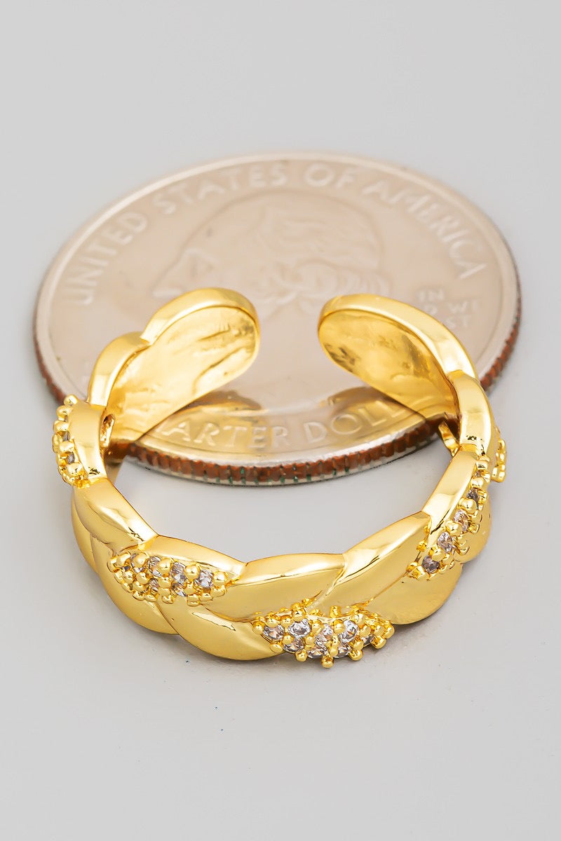 The "Confident" braided ring features a delicate gold braid, adorned with small cz stones. Its adjustable design allows for a comfortable fit, making it the perfect accessory to elevate any outfit. Exude confidence with this elegant and versatile piece.