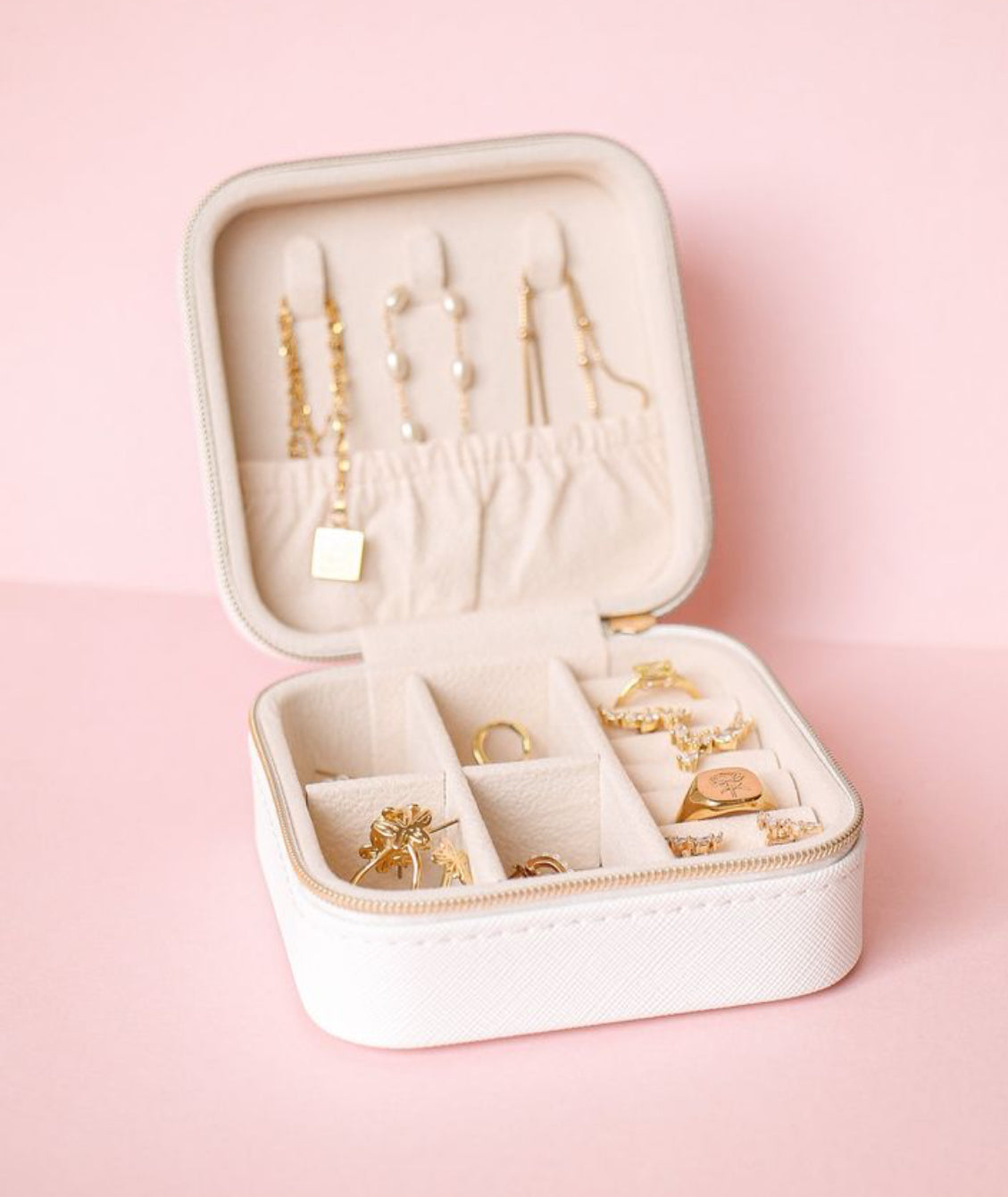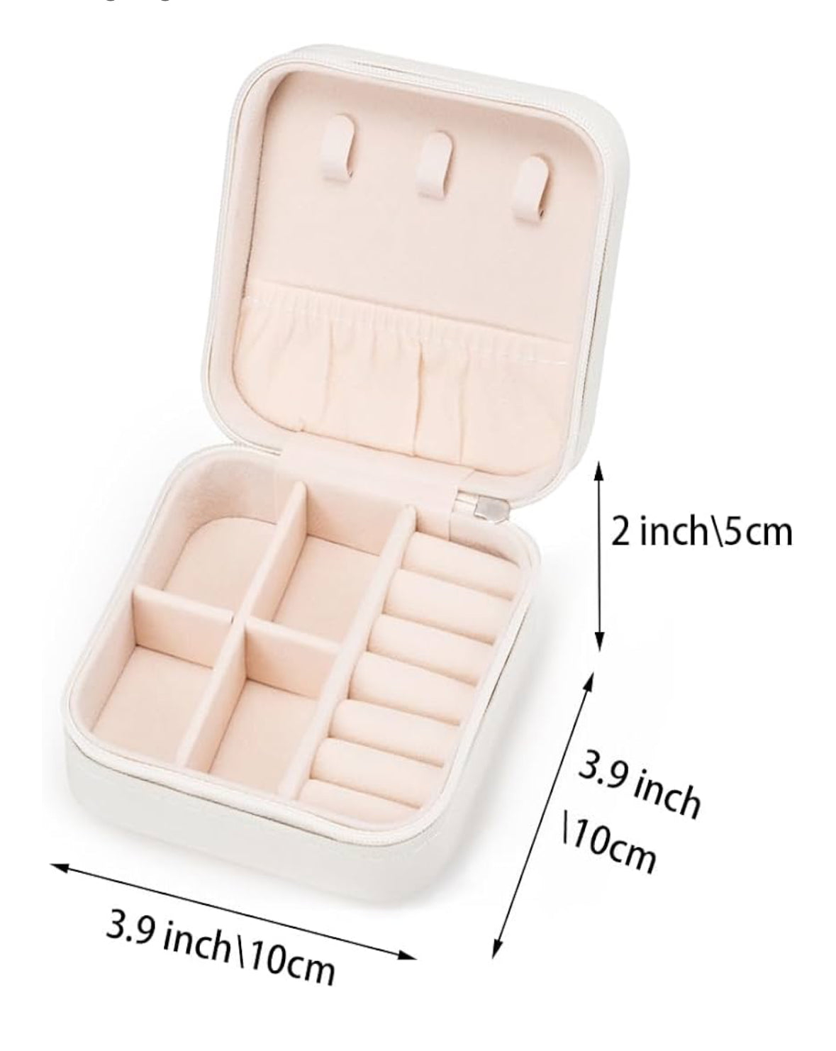 This small travel jewelry case is made of white faux leather, ideal for those who are always on the go. With its compact size, it easily fits into purses for convenient transport. Keep your jewelry organized and safe while traveling with this stylish case.