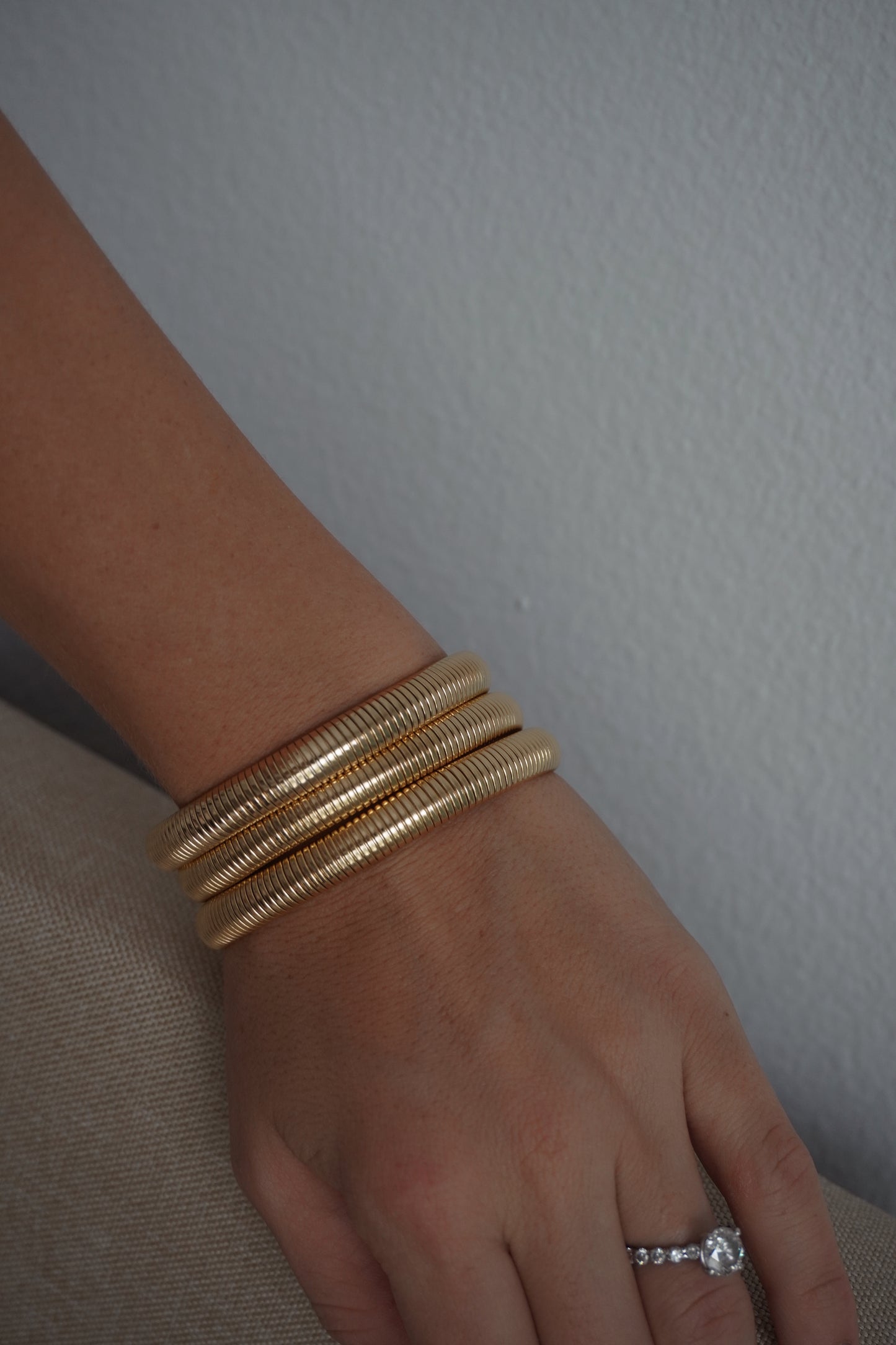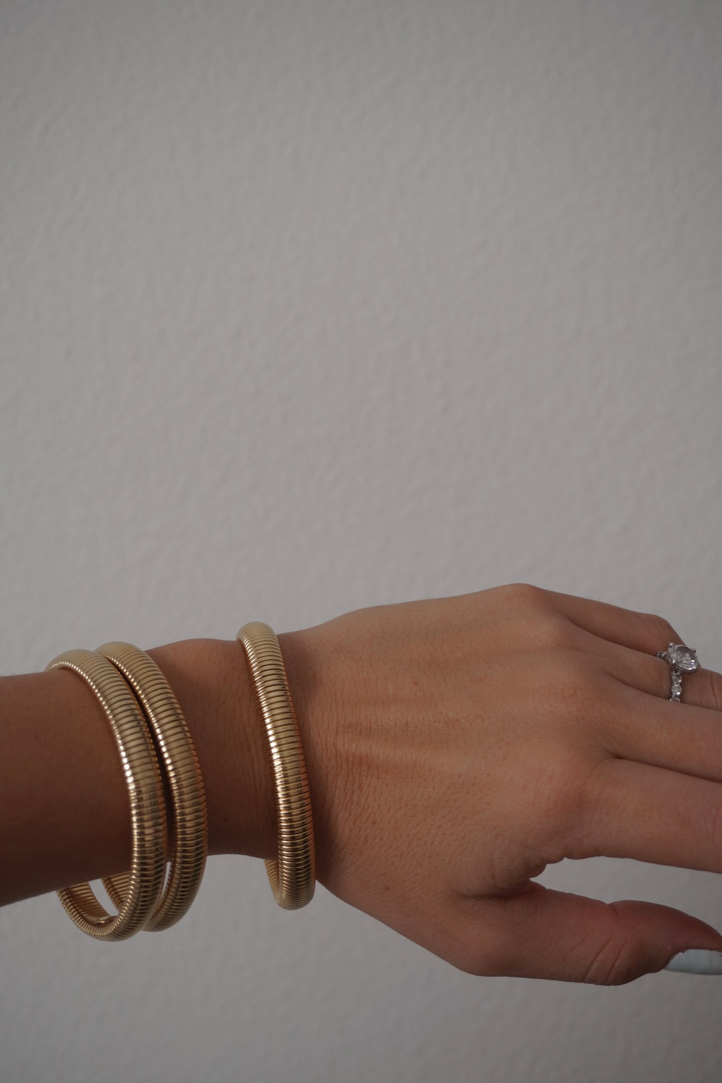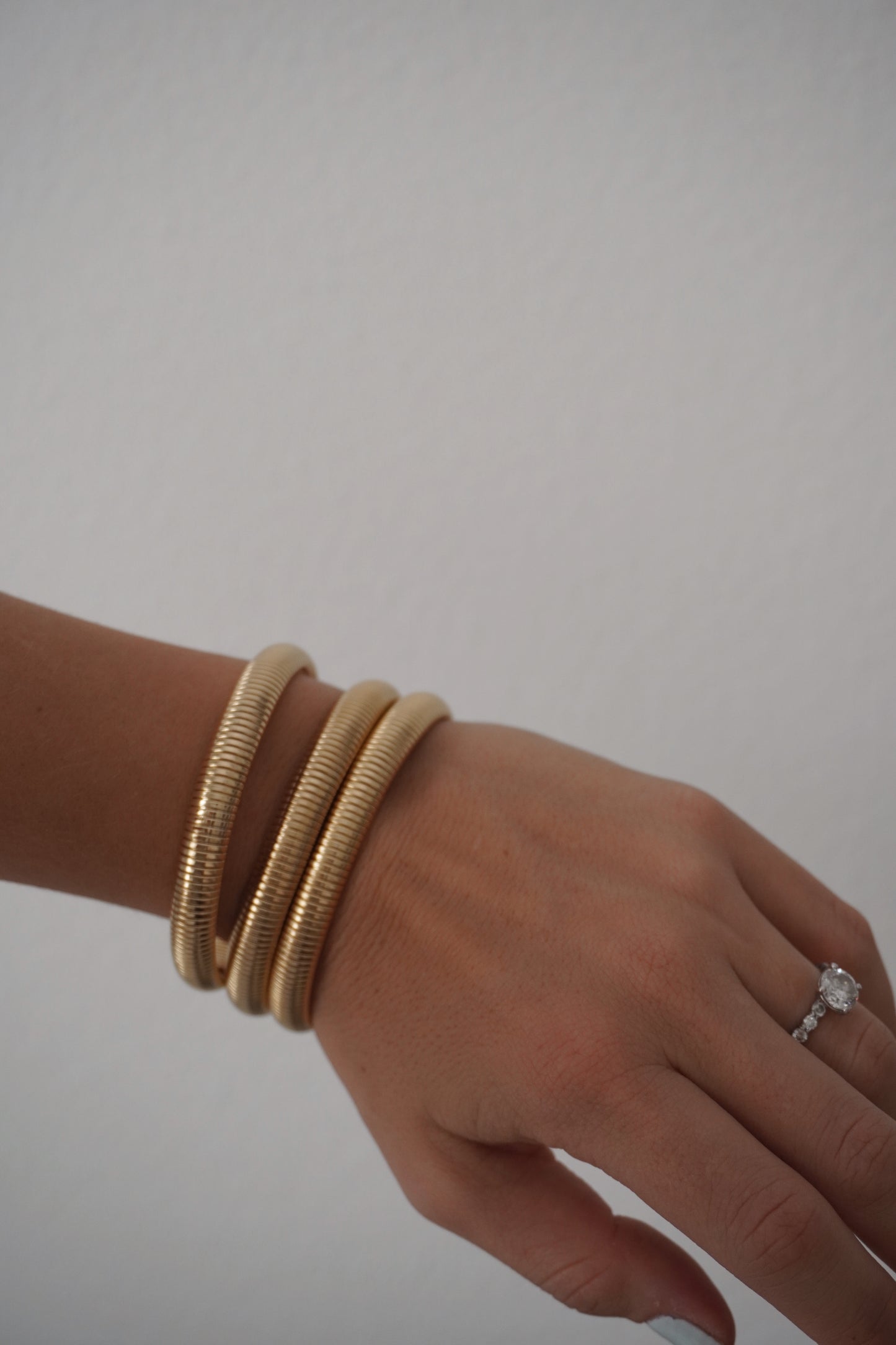 The "Nova" bracelet is a versatile minimalist accessory, featuring a chunky bangle that offers a slight flexible stretch. Each bangle sold separately. Its timeless design seamlessly complements any outfit, making it a must-have for any wardrobe. Upgrade your style with this functional and trendy piece.