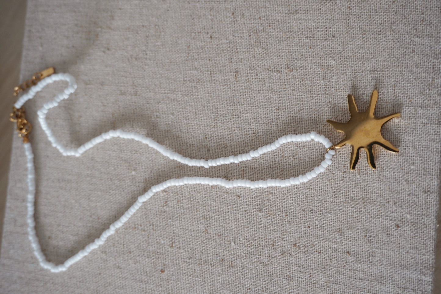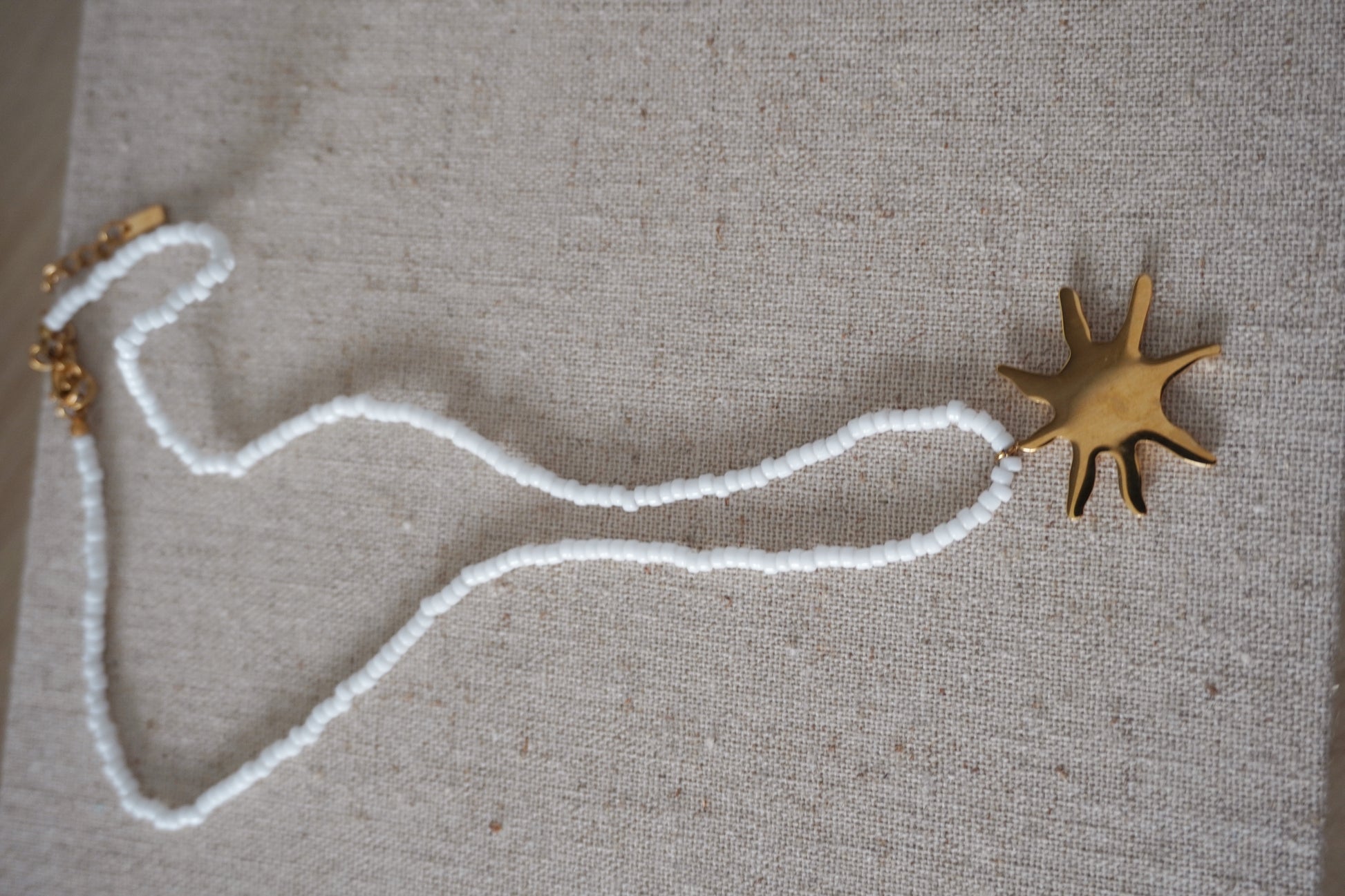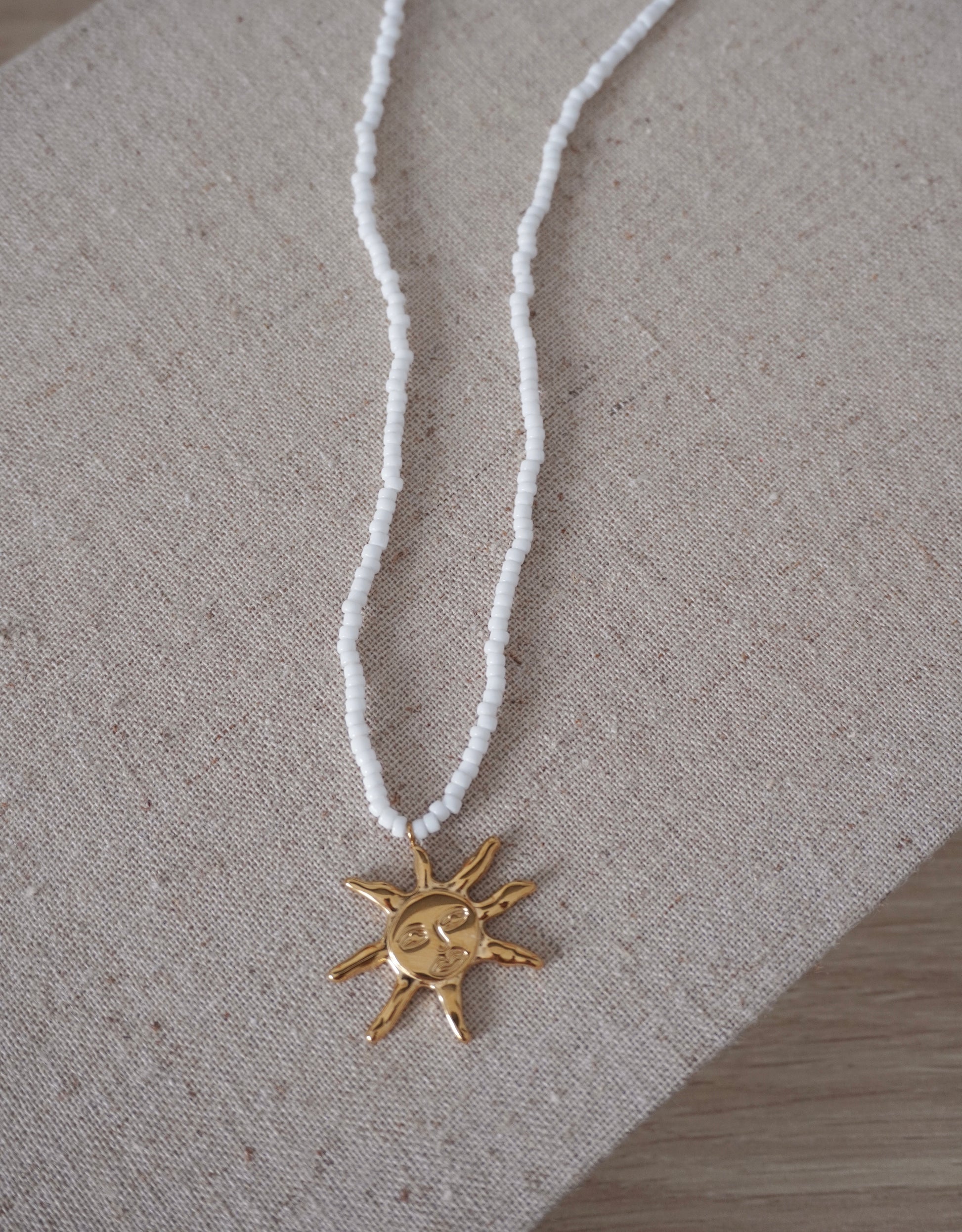 Add a touch of free-spirited charm to your outfit with our Sunseeker beaded necklace. The white beads and larger smiling sun charm are perfect for layering, while the 18k PVD gold plating adds peace of mind while wearing on your beach days and ocean swims. Embrace the joy and positivity of the sun with this necklace.